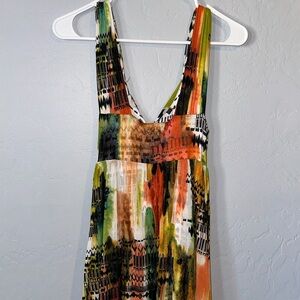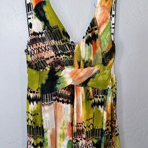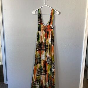This stunning sundress features a flowing maxi length, perfect for warm weather. The vibrant design showcases shades of tan and green, complemented by accents of yellow and cream, creating a lively and eye-catching look. Ideal for resort wear, this sleeveless dress offers both comfort and style for your summer adventures.