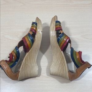 These stylish leather huarache wedge sandals feature a striking combination of tan and multicolor hues, perfect for adding a touch of color to your summer wardrobe. The open-toe design and gladiator-style lacing system offer a chic and comfortable fit. Crafted with a light-colored wedge heel, these shoes are ideal for casual outings or boho-inspired ensembles.
