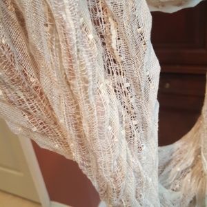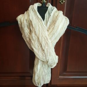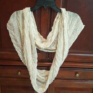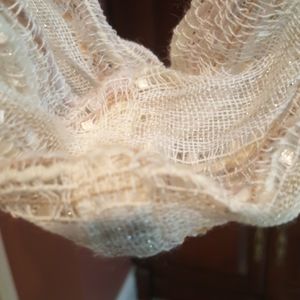 Beautiful lightweight eternity knit scarf with subtle shimmer threads running through it. It's a very pretty soft pallet of ivory, tan and a subtle dusty rose. Great year round scarf!