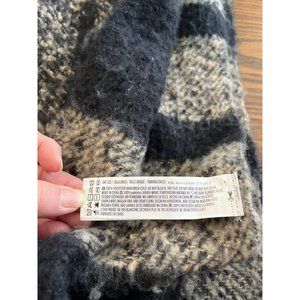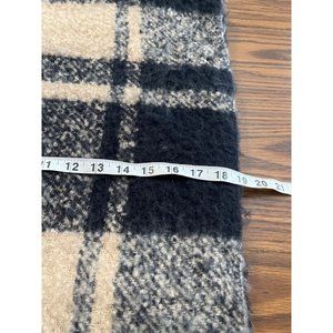 Tan black plaid scarf with fringe. 83”x19” approximately. Hand wash, do not dry clean. Good pre-owned condition.