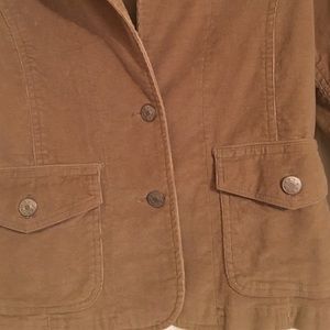 Tan corduroy blazer with silver buttons and 2 pockets in the front.