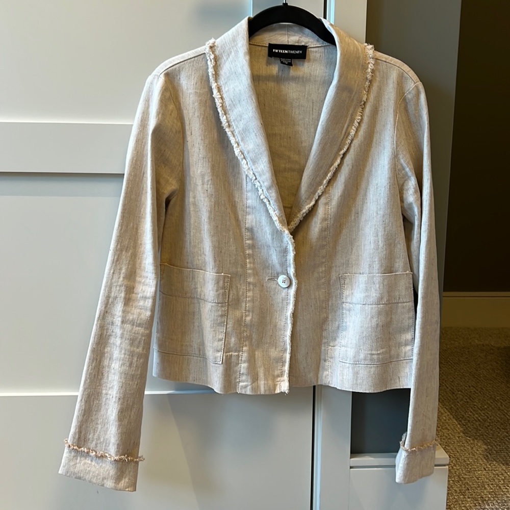 Elegant cream blazer with frayed edges. Single button closure. Perfect for any occasion!