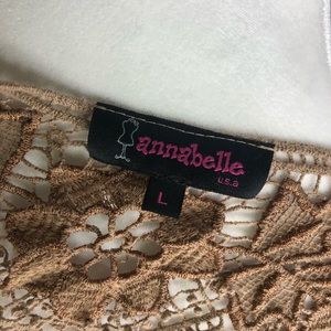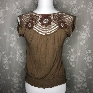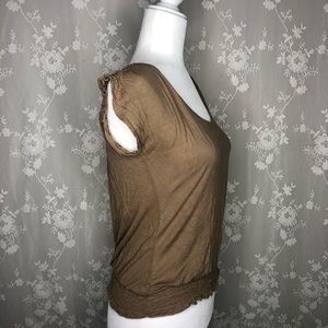 Tan blouse with lace floral backing Gently used, like new condition Size: L