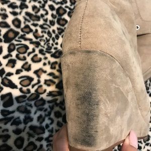 Tan heeled booties. Perfect for those winter and fall outfits. Does have some scuff marks on the back of one of the boots.