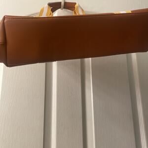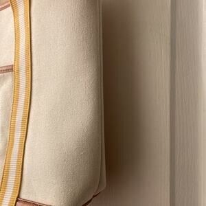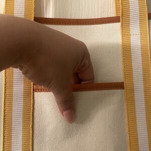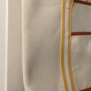 Cute canvas book tote with short handles. New and never worn. Yellow and white straps with faux leather detail. Side pocket on the front and zip pocket inside. Great for the beach, travel, and more. Please see photos and video for additional transparency.
