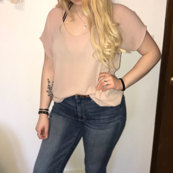 Light-weight tan colored blouse, versatile, worn. Size Medium.