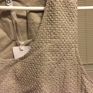 Tan cocktail dress fitted with small designs throughout dress. Brand new tags still attached