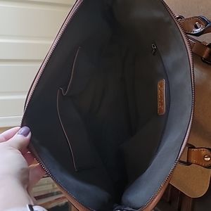 gently used tan handbag with shoulder strap