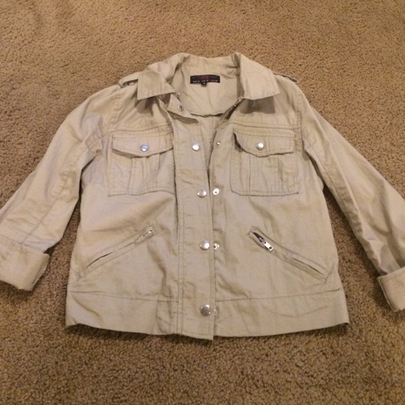Tan jacket with pockets. Only worn once. Got it from a store in Europe called "new look", size is a 12, but it is a small/medium in US sizes.