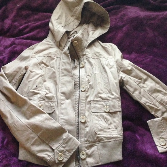 Tan zip up jacket with hood and silk inside