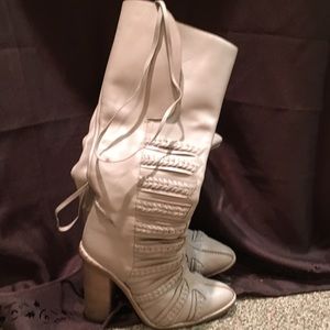 Tan leather heeled boots (3 inch heel) with woven detail along the front and sides. Boots come up around knee length. They're form fitting at the foot and are looser along the calf. They're a size 9, but fit more like an 8. Only worn 2 times. They look great with skinny jeans or a casual dress.