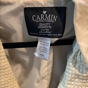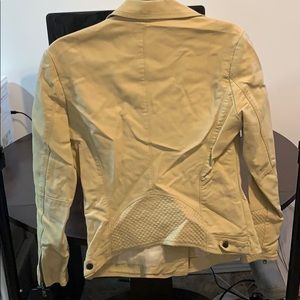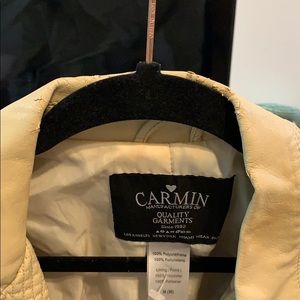 Tan leather jacket, Size: Medium. Worn on the neck.