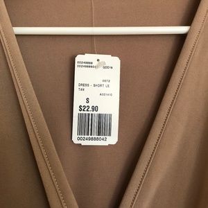 Tan long sleeved dress from Forever 21. This soft knit dress features a mock-wrap design, a surplice neckline, long sleeves, and a self-tie waist detail.