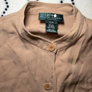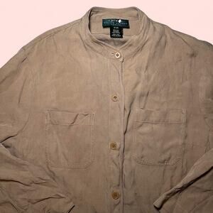 Tan Ralph Lauren silk button-up shirt with a relaxed fit