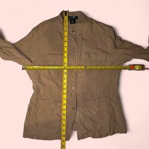 tan, silk shirt, relaxed fit, button-up, casual, minimalist, preppy, soft fabric, neutral tone, petite fit