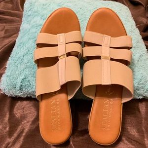Soft sole, stretchy straps, size 10 tan wedges. Super comfortable.