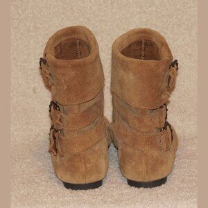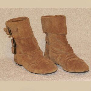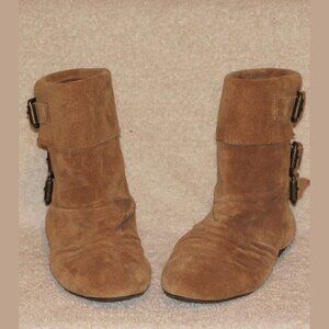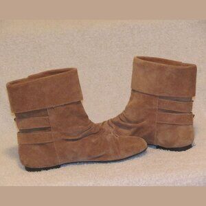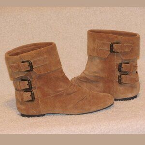 Tan booties by Gianni Bini. Suede scrunched at round toes. Three side buckles and 1/2” heel . Size 7 ½, very lightly worn