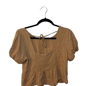 This elegant tan blouse features a smocked design with a charming tie front, adding a touch of sophistication to your wardrobe. The short sleeves are designed with a romantic puff style, offering a feminine flair. Perfect for a casual day out or a stylish evening, this blouse combines comfort with chic style.