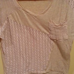 Tan top with lots of different kinds of pattern.