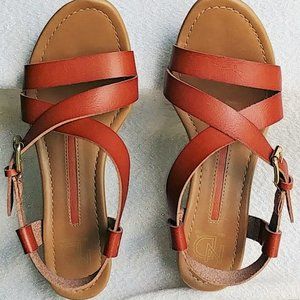 Wedge height is 1.5 inches, tan leather with buckle closure. Worn twice, in excellent condition. Purchased at Belks. Size is 8 but it fits like a 7.5.