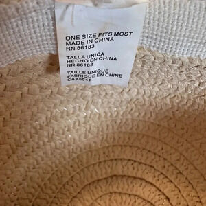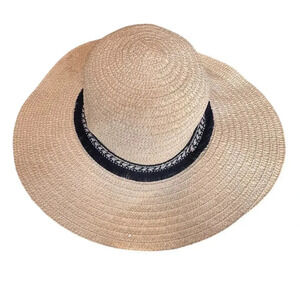 Tan wide rim floppy beach hat with navy & silver ribbons