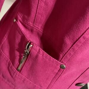 Beautiful dark pink jacket with suede like material. Buttons all the way down the front. Cute old silver tones buttons. Has functioning pockets in the front with zippers. Cute button details on sleeves and jacket is lined.