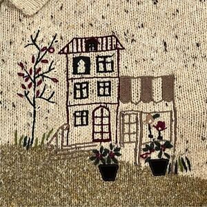 Beautiful full zip sweater with a full embroidered design on the front showing a woman walking a dog in front of homes flanked by trees and flowered plants. Additional flowers, plants, walking path, and other darling details add quaintness to this amazing sweater