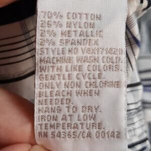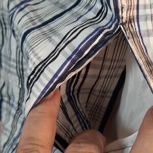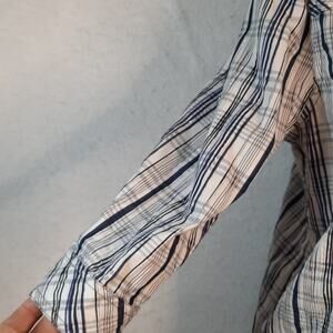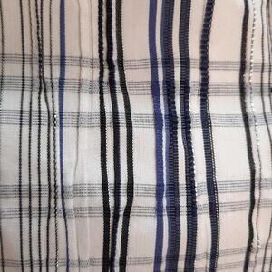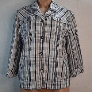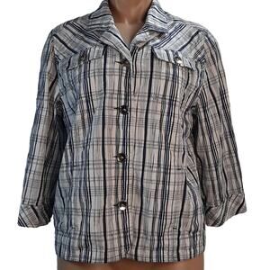TanJay Jacket Top Shacket with 3/4 Sleeve Metallic Buttons Women's Size 10. White with large grid blue, black and shiny silver plaid. Silver colored metal buttons. Two breast pockets with button down flaps. Two vertical waist pockets. Could be worn alone or with a tank or shell underneath. Heavy enough to be a very lightweight jacket.