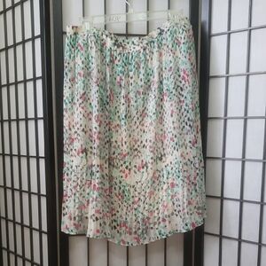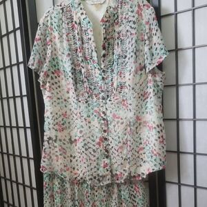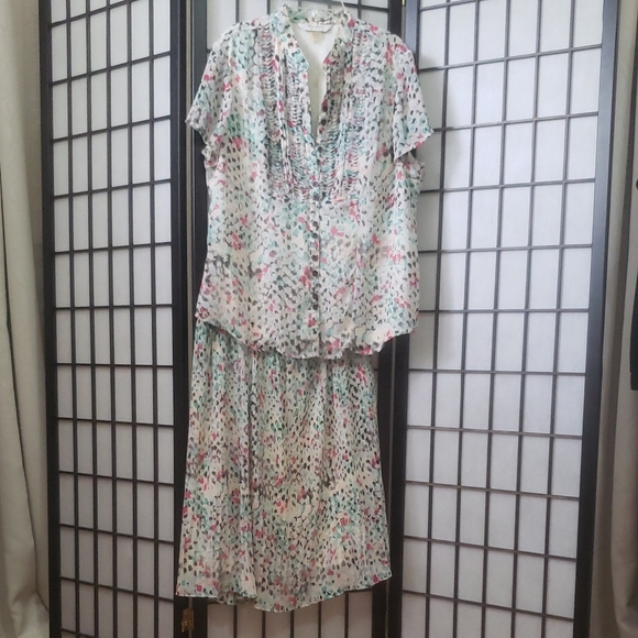 Multicolor pink, aqua and white 2 piece set..blouse and pleated flowy skirt with elastic waist, fully lined. Ideal for any occasion. Size 14P Machine or hand-wash cold water.