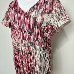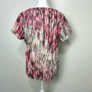 TanJay petites blouse, women’s petite medium top, short sleeve v neck shirt, ruffle front blouse, abstract print petite blouse, neutral work top, classic petite medium shirt, TanJay career blouse