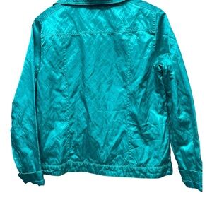Chic bomber jacket by TanJay. Vibrant teal color. Features zippered pockets and a classic collar. Approximately 20.5 inches pit to pit.