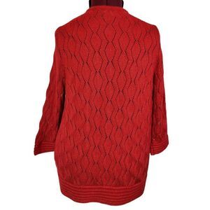 Rich red color with metallic gold tone thread to give this cardigan an extra shine, knitted in beautiful pattern, open front, long sleeves, regular fit, great for any occasion. Great condition.