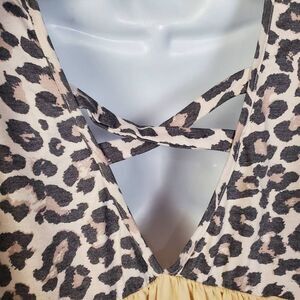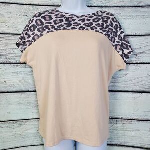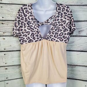 Tan Leopard Print Women’s Top Size M Short Sleeve Back Cross Detail Stretchy