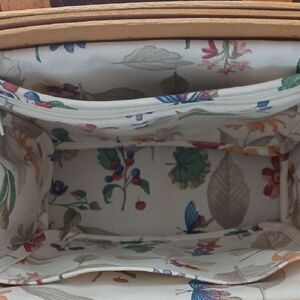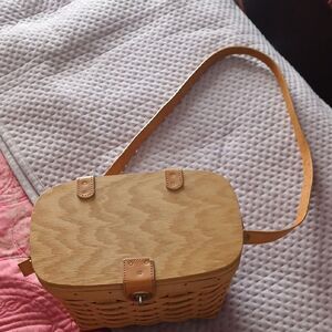 Vintage 1999 Longaberger tan woven basket bag perfect for casual outings. Features a secure clasp and sturdy handle for easy carrying. C-3. 8.5 inches wide and 7 5 inches high.