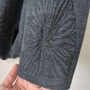 reversible jacket tandem style 0102e made in Italy 50% linen 24% rayon viscose 23% cotton 3% elastane reversible has pocket snap closure. one side is heathered gray. other side is a printed pattern. tapestry lag and look art to wear artsy Italian top