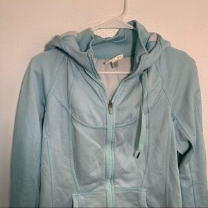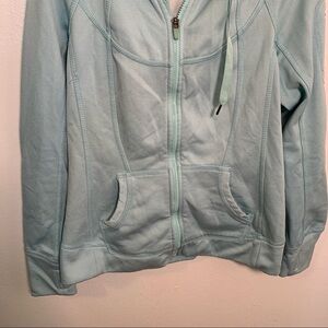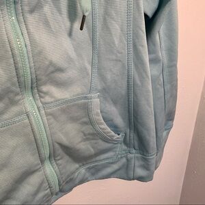 Good condition, minor spots on cuffs. Tangerine. Full zip athletic jacket. Hooded. Thumboles. Fleece lined. Looks like a teal color, but name is mint. Subtle stripes. Style FW9006C267. Size Medium. 100% polyester. Pit to pit laying flat 18” Shoulder to hem 23.5” Sleeve (pit to hem) 20”. All measurements are approximate and taken lying flat. Smoke free home. No trades, offers welcome.