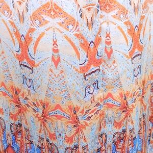 Brighten up your wardrobe with this Tangerine NYC sleeveless mini dress, featuring a bold geometric and abstract print in orange and blue tones on a light background. Made for casual or summer wear, this dress is fully lined for comfort and features two side pockets and a back neck tie detail for a subtle, feminine touch. The symmetrical print adds a polished look, while the sleeveless cut and mini length keep it breezy and stylish.