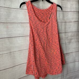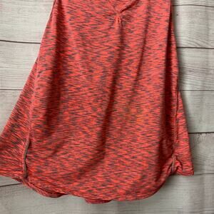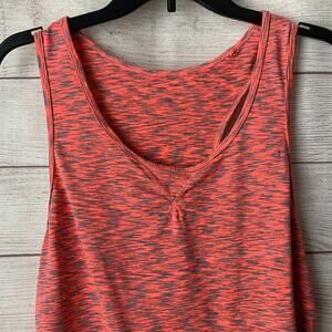 Racerback tank top in a neon coral and gray pattern by Tangerine. (The coral is a mix between pink and orange. In my opinion, it leans towards pink) It has a scooped neckline and large arm holes. The back has the logo and 8 gray dots down the racerback. There's a short decorative grey strip on both sides/hips. It is pre-owned in great condition.