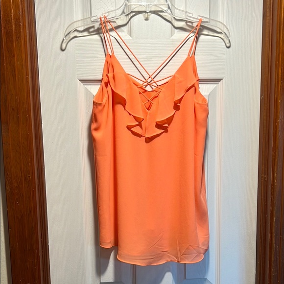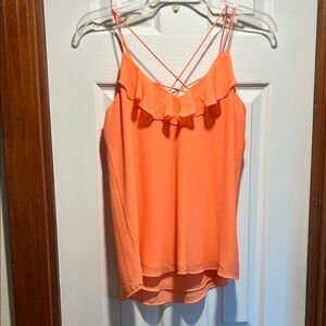 Brighten your wardrobe with this stylish tangerine ruffle strap top. Perfect for any occasion, this top adds a pop of color to your outfit.