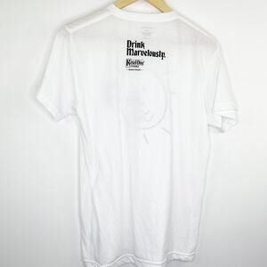 White black short sleeve graphic t-shirt. Crew neckline, short sleeves, graphic front.