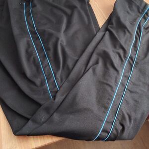 Long stretchy athletic pants with 2 tourquoise stripes down each leg