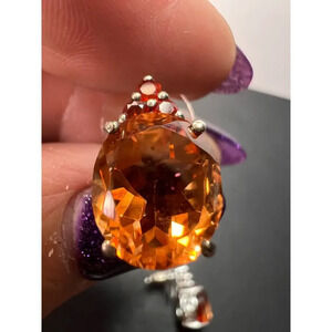 Stones test and view as fire opal (small orange accent stones) , and the big tangerine stones test as quartz and look to be color treated with a type of tangerine / orange color. Set in rhodium or platinum plated over sterling silver.