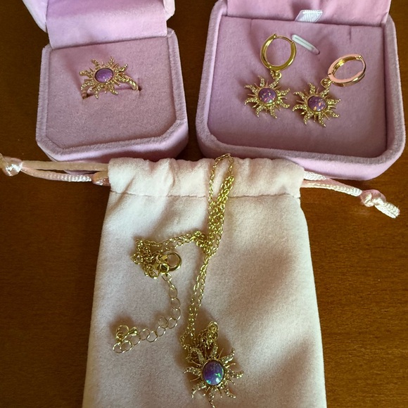 Elegant gold and purple sunburst jewelry set featuring a necklace, ring, and earrings. Ring is about a size 6. Brand new. Gorgeous set!