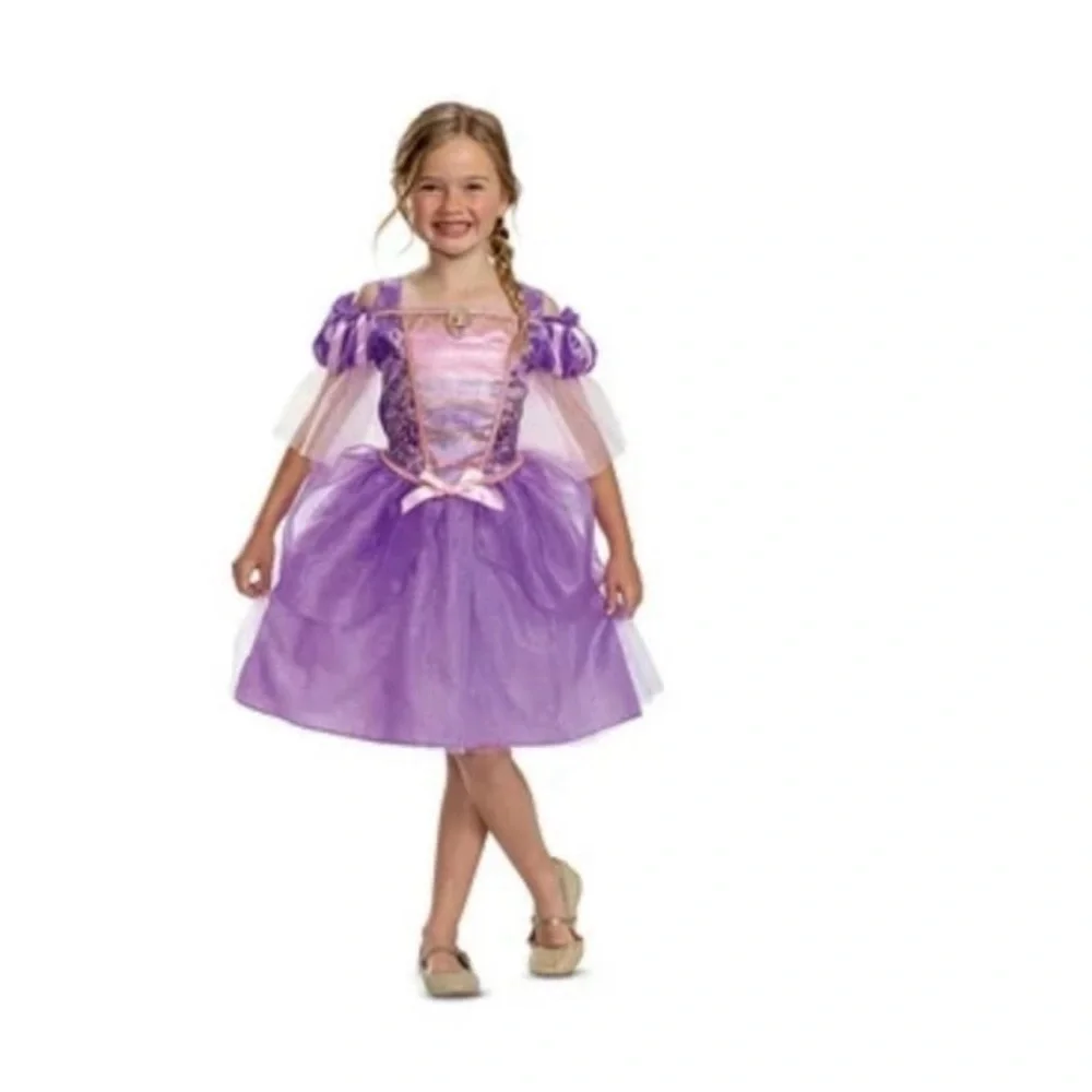 Find the floating lanterns and explore the city of Corona with Pascal by your side in this Rapunzel Classic Child Girls Costume, sold exclusively at Walmart! This enchanting satin dress is designed to capture the magic of Rapunzel's fairy tale, featuring a sparkling satin bodice with sequin metallic trim that shimmers with every movement. The puff sleeves with long ruffle accents add a regal touch, while a sculpted Rapunzel character cameo sits elegantly at the neckline. The layered skirt has a draped peplum, ribbon bow at the waist, and a sparkly top layer, making this gown fit for a true princess. Perfect for Halloween, dress-up, or Disney-themed adventures, this costume lets little ones embody the essence of Rapunzel!
