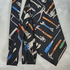 Tango By Max Raab Tool Time Mechanic Home Improvement Black Necktie Tie. All around imprints of hammers, adjustable wrenches, screwdrivers, pipe wrenches & pliers. Bright colors of green, orange, white, blue & brown. Widest point of tie is 4". No rips, snags, fading or stains. Like new condition!