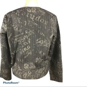 This jacket has print and and the other side is plaid black, khaki and purple.