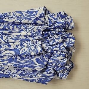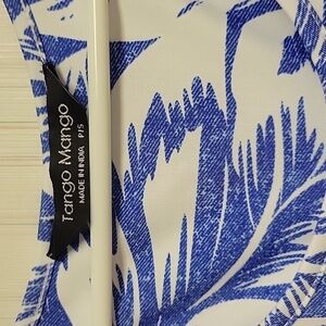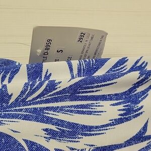 Tango Mango Stylish sleeveless dress with a blue and white leaf pattern. Bottom is hustles creating a fuller skirt. women's sz small. 95: polyester, 5% spandex. knee length. New with tags. 35" chest, 32" waist, 35" shoulder to bottom (D1-039)