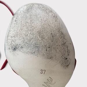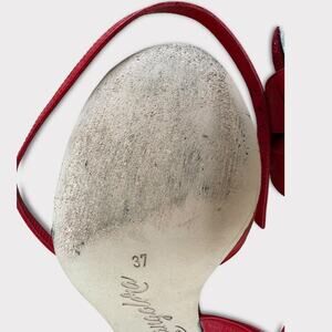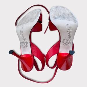 Stunning red leather sandals in exceptional pre-owned condition. These elegant strappy heels feature a sophisticated open-toe design with multiple leather straps that create an eye-catching crossed pattern across the foot. The rich red color and glossy finish make these perfect for special occasions or adding a pop of color to any outfit.
