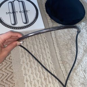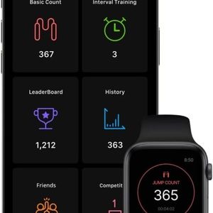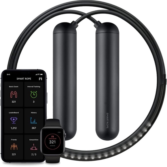 Essentially brand new! Comes with all original packaging, directions booklet, and carrying case. Tested it out once but live in apartment and people below me weren’t thrilled with noise. Connects to phone or Apple Watch via app so you can track your workout stats. It also has an LED display so you can see count while you jump. Only sign of any use is a little wear on the bottom from its little trial run in my apartment. Size medium. Connects to phone Via Bluetooth and SmartRope app.