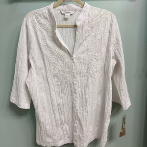 Tanjay White Embroidered Button-Up Blouse 3/4 sleeve size 14 mandarin collar